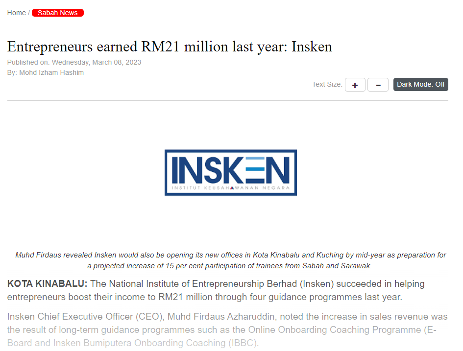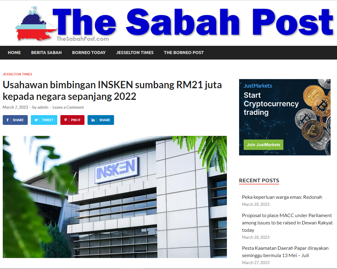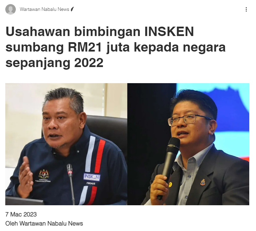 | Nabalu News - USAHAWAN BIMBINGAN INSKEN SUMBANG RM21 JUTA KEPADA NEGARA SEPANJANG 2022